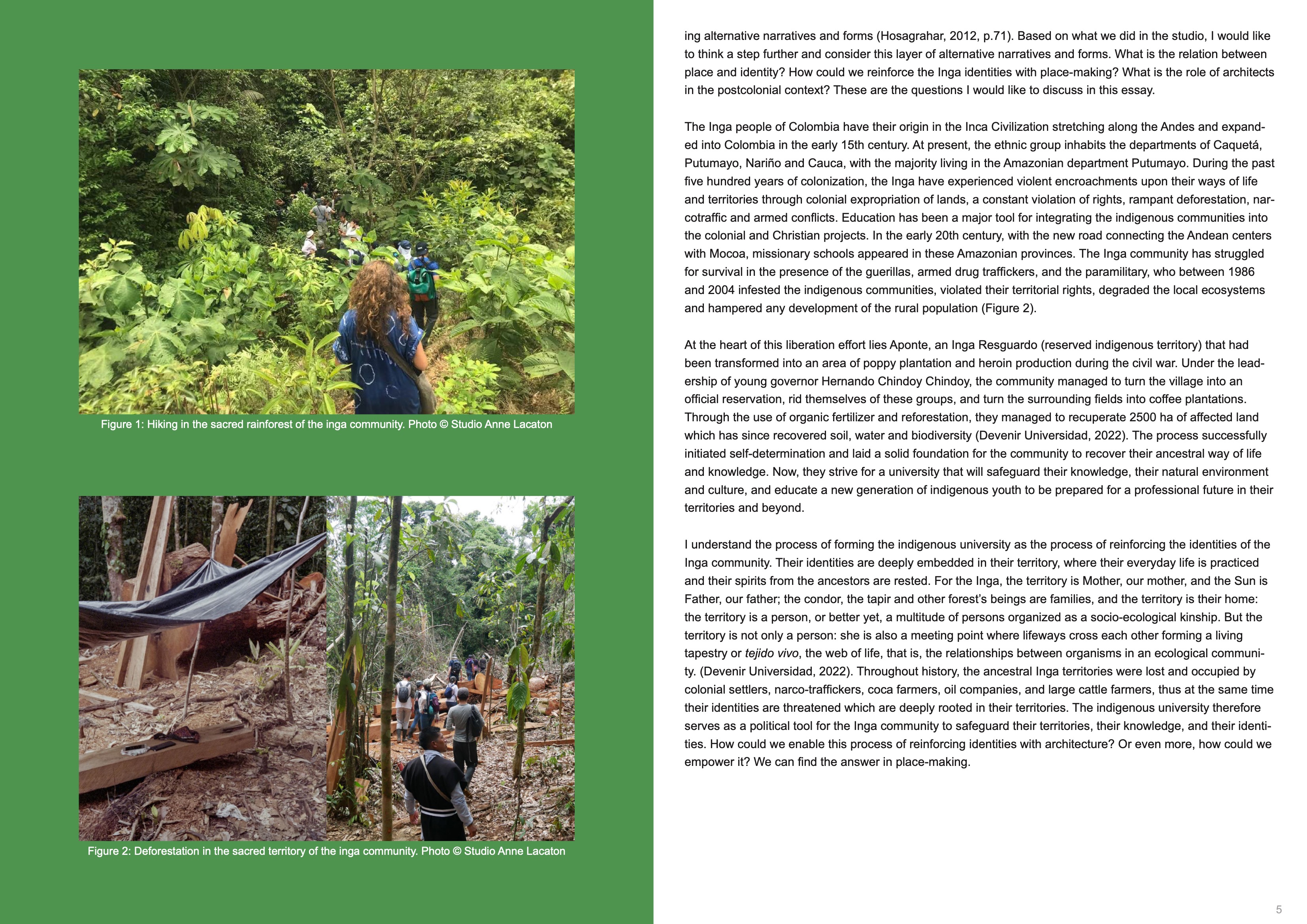In the studio, we were working mainly on what we know in the architecture profession without considering too much of the layer of culture identities, since we know very clear that we cannot know better than the Inga on this part. However, in this essay,