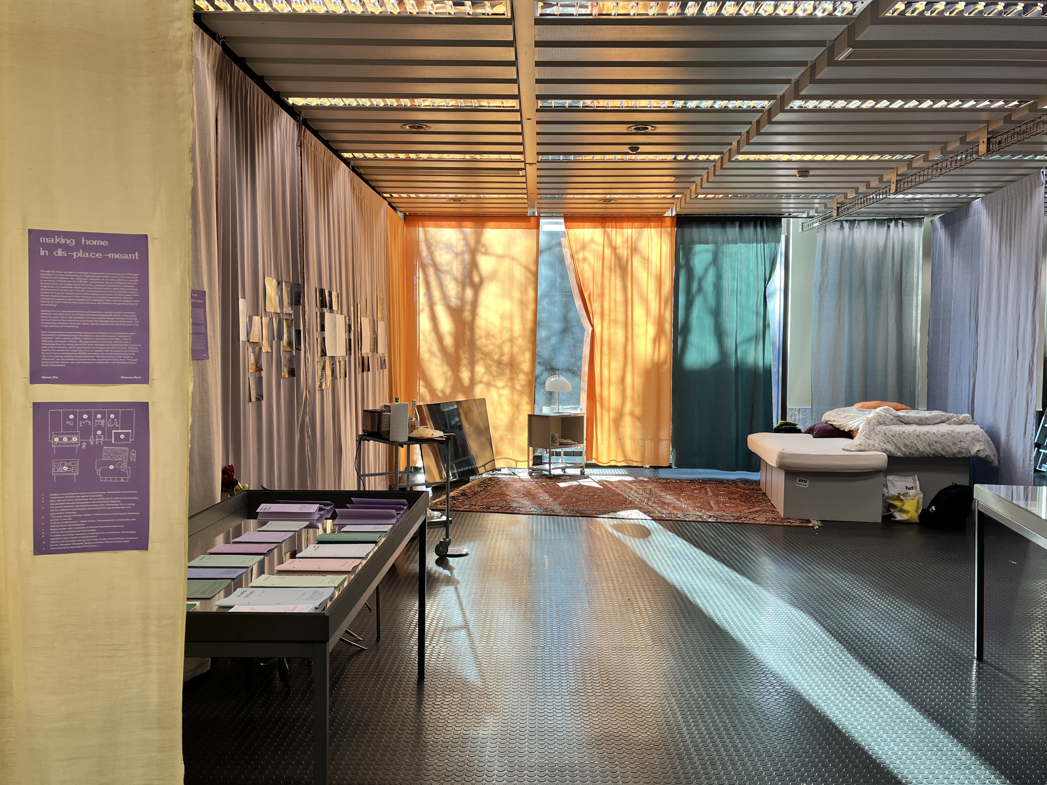 From a broad series of home studies varying from historical and contemporary queer communes to individuals living in the diaspora, we outlined several “practices of resistance”: labor, opacity/visibility, messiness, elements of orientation, house of difference, and power of fiction. We appropriated a soon-to-be-sold ETH villa at Voltastrasse 18 as the testing ground for these strategies and transformed the institutional setting into a domestic one by queering the use of space and office furniture. Weaving together the dreams and imaginaries from our research with the experiences of hosting the queer space working group (QSWG) and others, we saw the homemaking at the villa as an ongoing collective living experiment. This first iteration of the “house of differences” was documented in various formats, including the fiction book “The queer beings and their friends” and a film produced in collaboration with filmmaker Filémon Brault-Archambeault.